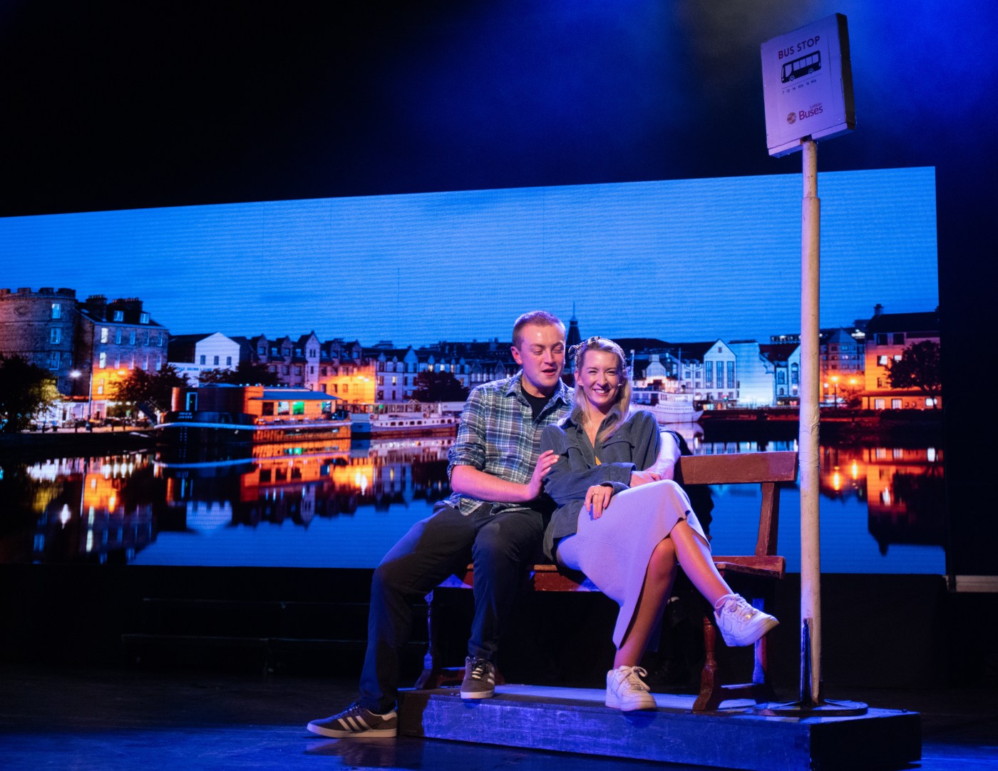 Firstly the overall quality of this production for being by an amateur company was phenomenal, the stage crew has to be commended for some relatively slick scene changes – some were a little shakey. However, we can excuse pernickety curtains and sticky wheels. The show’s physical set design was simple, the main pieces were a raised platform above the stage, a screen upstage, which gave the audience the indication of setting, and the various furniture set pieces like chairs, tables, beds etc. The screen was effective; as a now Edinburgh local I clicked on to some familiar places fairly quickly. The use of the raised platform was great when monologues were being delivered, however depending on audience sight-lines – the taller actors heads were slightly obstructed but not enough that it really affected the performance.