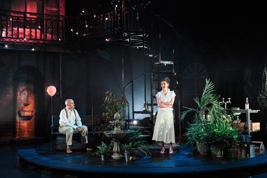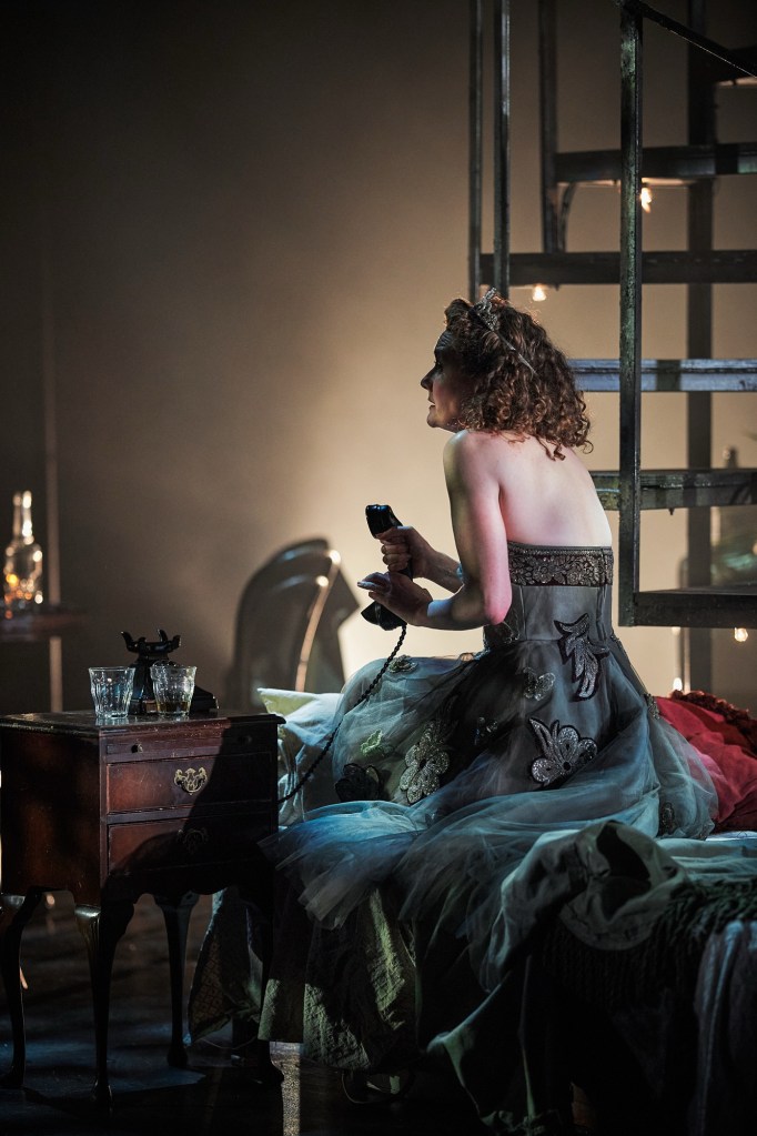 The set design from Emily Jones is absolutely breath taking. It beautifully draws you in as it brings to life the true reality of living in a very small apartment. In the centre of the stage is a spiral staircase leading to the neighbouring apartment upstairs from Stella and Stanley’s. The staircase is tastefully lit with delicate fairy lights that seem to almost imitate the twinkling stars in the New Orleans night sky. The stage rotates which allows the audience to view the confined apartment from different angles and points of view- very much like the play itself. The stunning lighting by Jeanine Byrne is a real treat to the audience’s eye- the mood is set just right with cascading colours of green and copper. The golden lights that shone upon the upper dress circle accompanied by the sounds of passing trains created a deeply immersive experience.