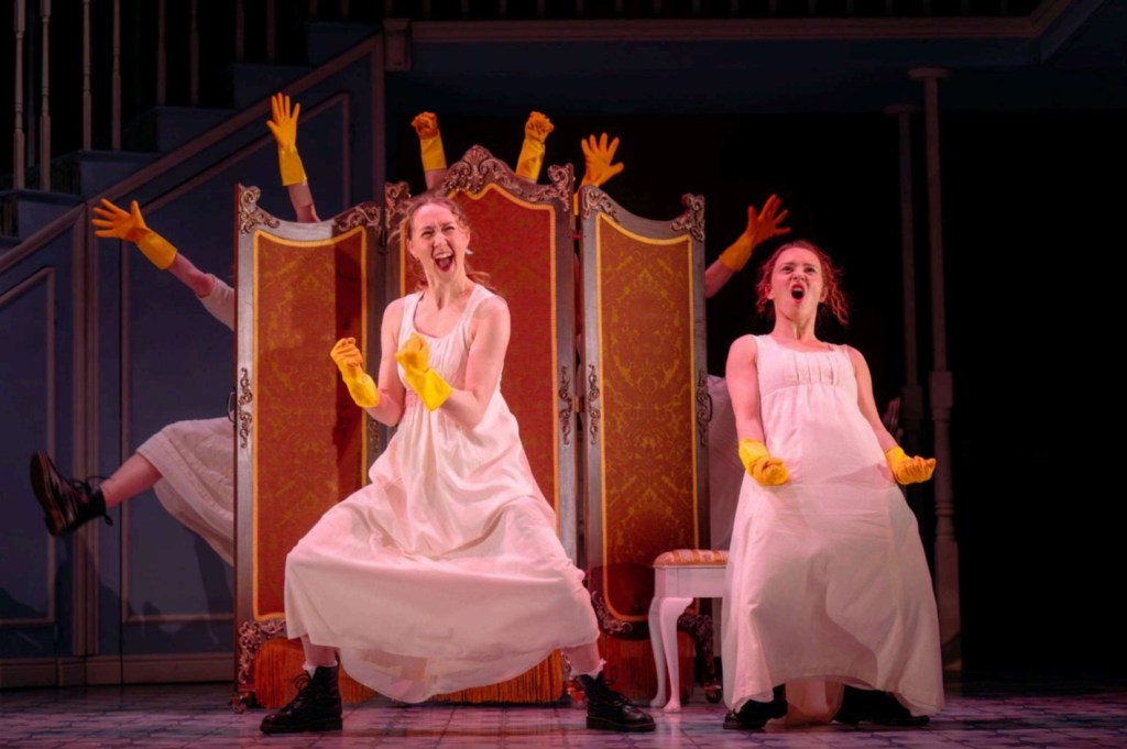 Jabares-Plta’s costumes are simple yet very effective for what this production requires! It allows the five maids to transform into numberless characters by just adding colourful overdresses on top of their plain maid attire. For the more outrageous characters such as Caroline Bingley and Lady Catherine De Burgh the costumes become more elaborate and darker. The brilliant cast of five who undertake every role are able to change from one character to the next at lightning speed. This impressive precision, organisation and timing does not go unnoticed by the audience!