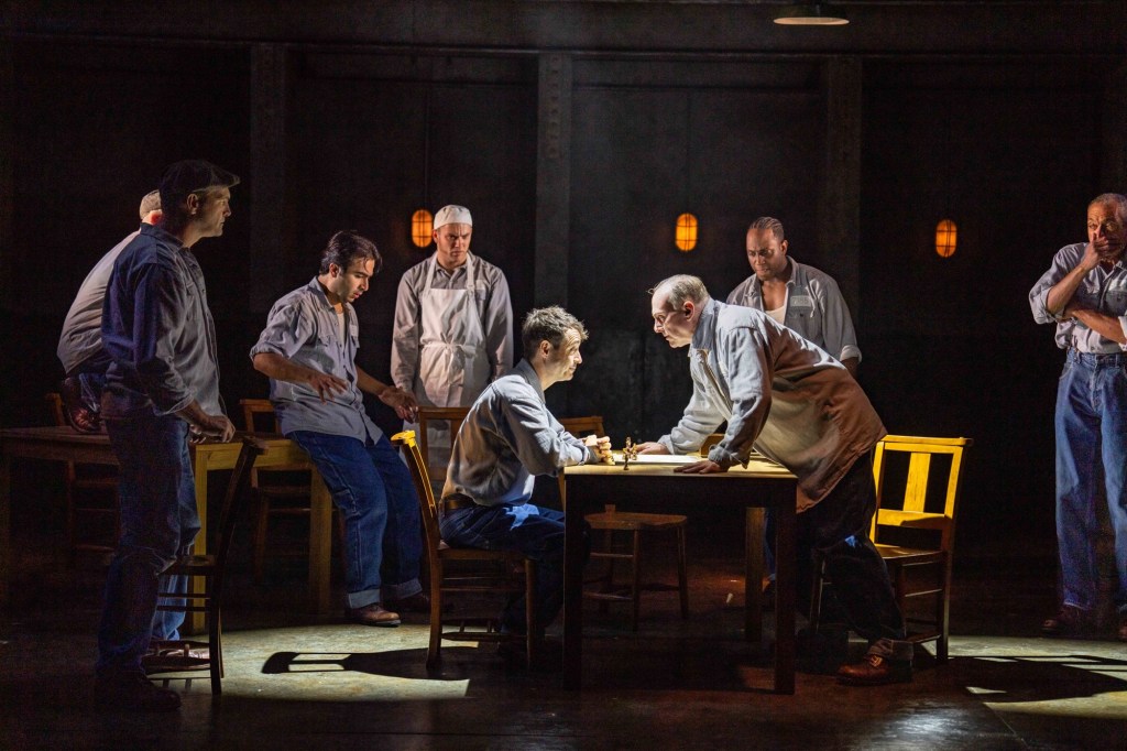 Gary McCann’s design captures both the scale and starkness of Shawshank. The imposing prison yard, overlooked by a guard balcony, constantly reinforces the inmates’ lack of power, while simple wooden tables and chairs are reconfigured to suggest multiple spaces within the prison. The addition of flown-in elements, wood-panelled walls for the Warden’s office and a bookshelf for the library, efficiently shifts the world without breaking the flow of the piece.